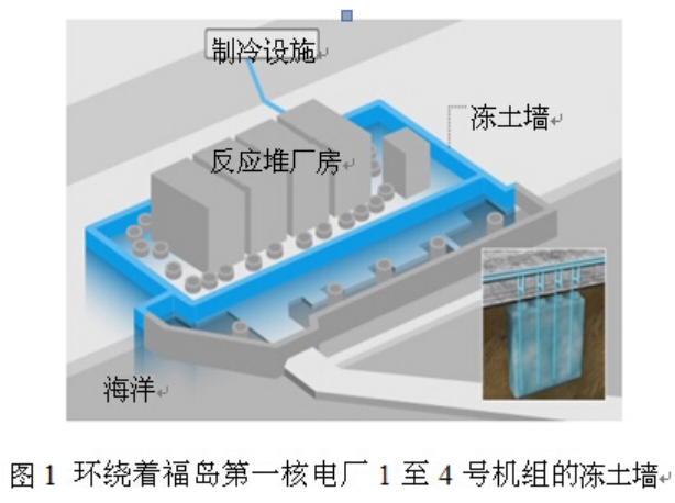 冻土墙的主要建造商鹿岛建造公司(Kajima)。冻土墙的建设原理是:在4台事故机组反应堆厂房周边的地下钻30~35米深的孔,插入管道,然后向管道中注入冷冻盐水(一种冷冻材料),从而使管道周围的土壤结冰,进而在反应堆厂房周边创建一道难以逾越的屏障。在建设过程中总计插入共计约1550根管道,从而在1~4号机组厂房周围建起一道1.5千米长的冻土墙。该冻土墙在失去电力供应的情况下能够继续保持有效最长达2个月。日本政府同意支付冻土墙的建设费用,约为320亿日元(2.78亿美元)。