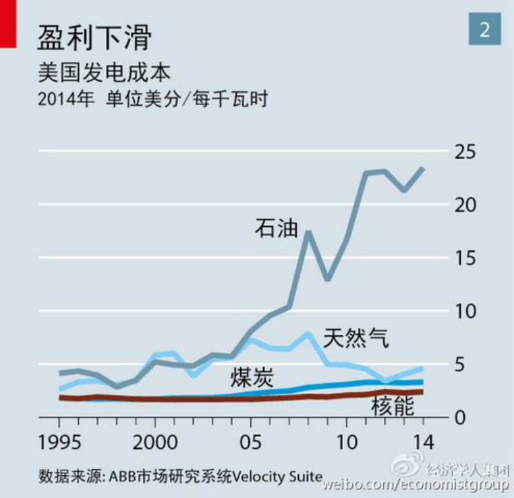 美国核能研究所(NEI)的研究显示,去年美国核能发电的平均成本达到每兆瓦时(MWh)24美元(即每度电2.4美分),低于天然气和煤炭。但“平均”数据掩盖了巨大的差异,如果我们考量每单位电力的生产成本,最低效的核电站所需投资实际上高过天然气和煤炭。而因为核电站的主要花费在前期的反应堆建设,运营成本差价缩小是个不好的兆头。同时,天然气价格还在不断下跌。