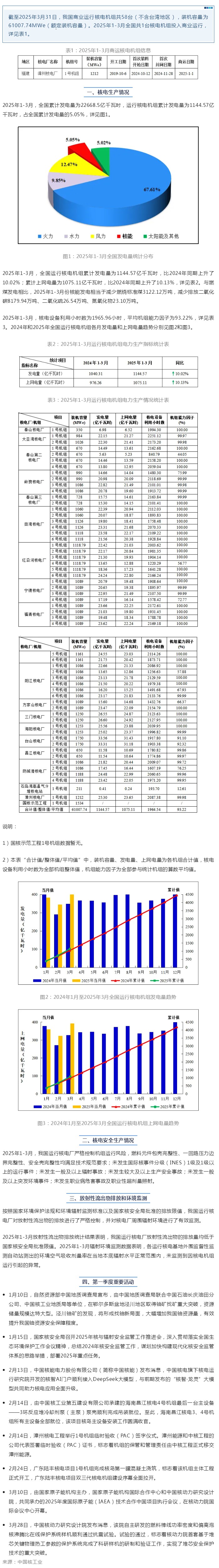头条 | 全国核电运行情况(2025年1-3月)
